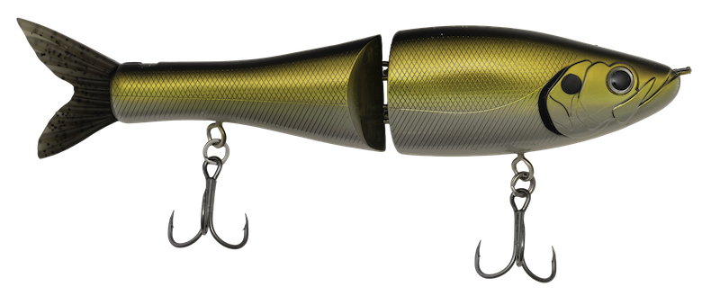 Poppa Pete is a silent slow-sinking glide bait weighing 5 Ounces and 10 inches in length, equipped with heavy-duty hardware, size 2/0 hooks, and rotating hangers. The tails are easily replaceable. Papa Pete has a nice wide glide on slow reel cranks and then can be shed fast for an erratic bait sh action and sinks extremely slow in a level position.